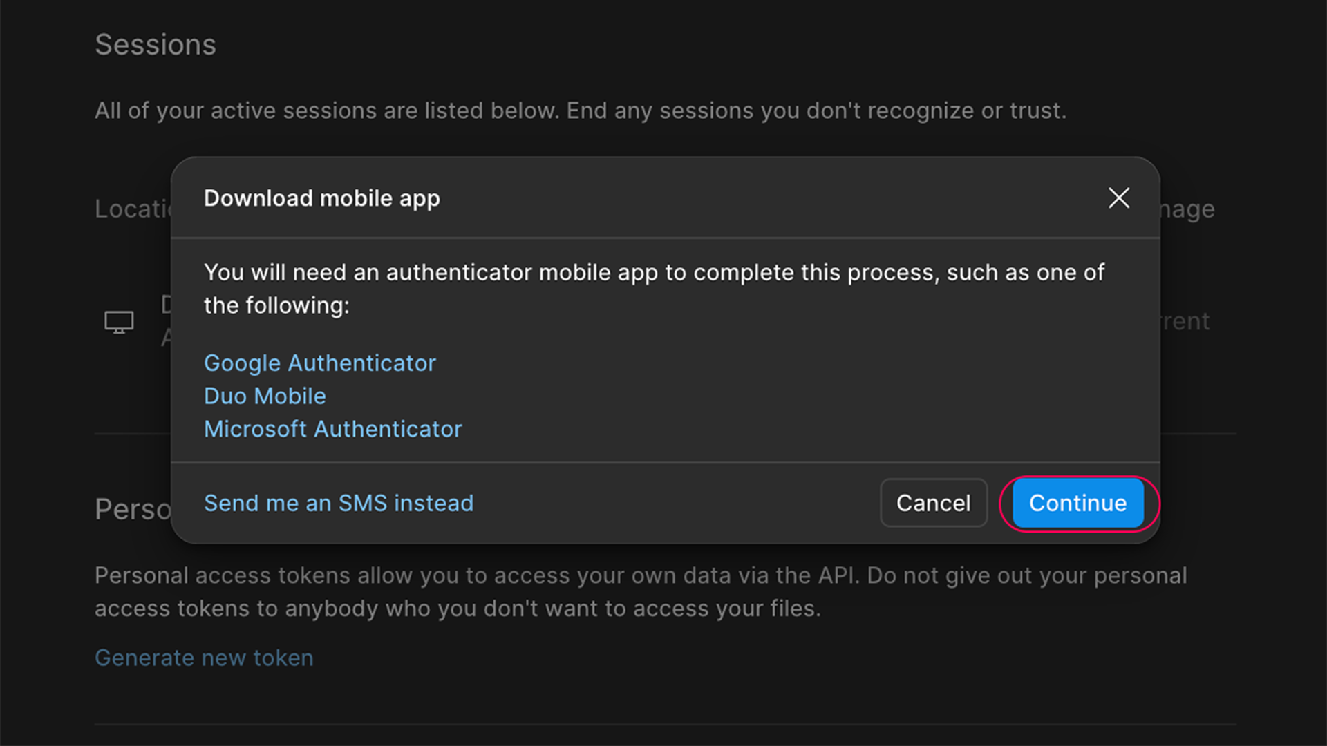 در سرویس Figma نیازی نیست روی نام Google Authenticator کلیک کنید. مسیر بهگونهای طراحی شده که با زدن دکمهی Continue، بهصورت خودکار وارد مرحلهی اتصال حساب به اپلیکیشن میشوید.گزینهی Send me an SMS instead نیز برای کاربرانی است که ترجیح میدهند کد تأیید را از طریق پیامک دریافت کنند؛ این مسیر کاملاً مجزا از روش اپلیکیشن است.
